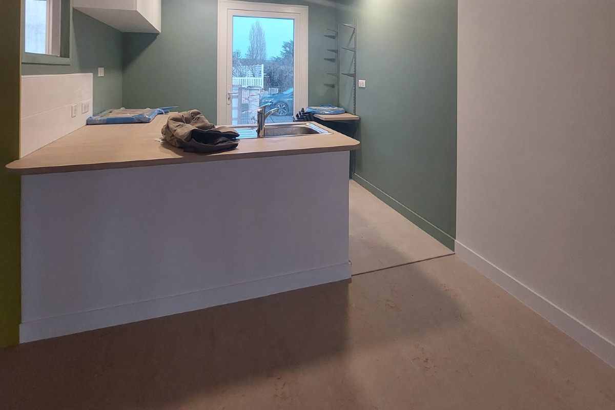 Elle a réalisé la peinture des murs et des boiseries et assuré la pose de sols souples en lés, soudés à chaud.